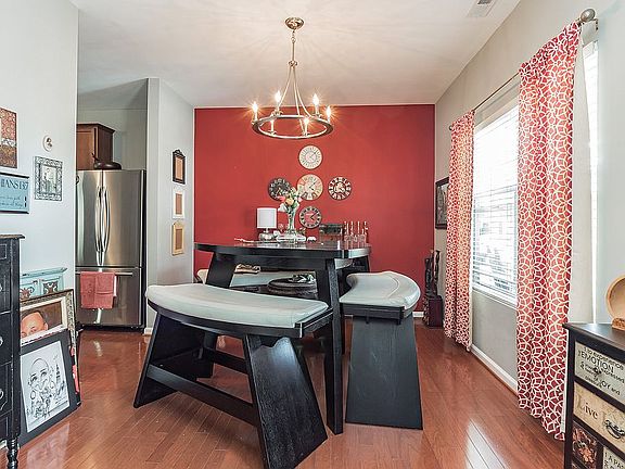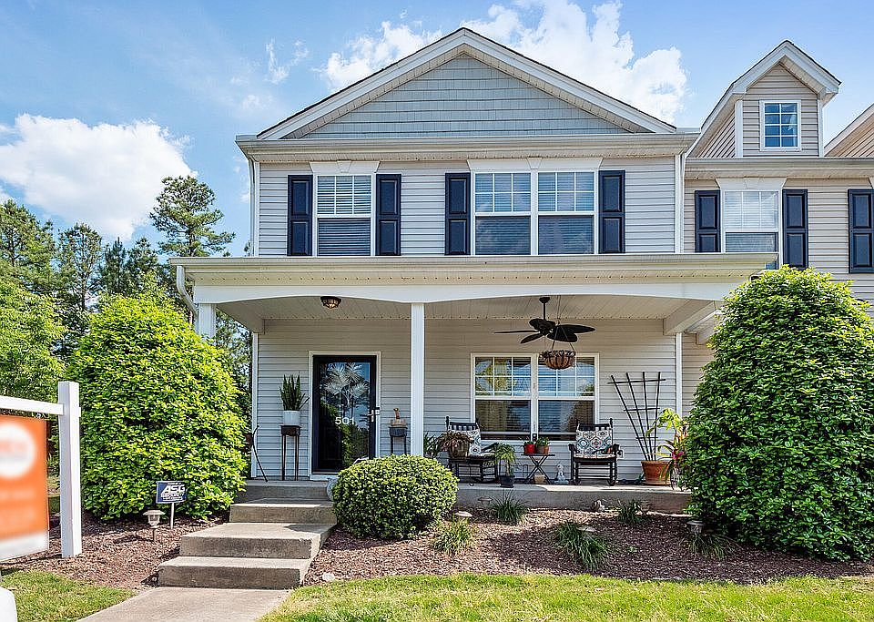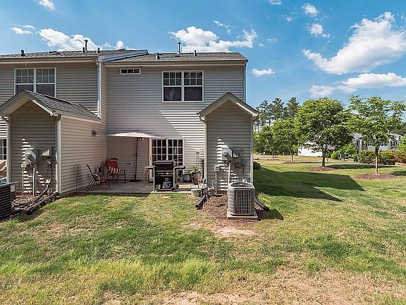Delightful 3 bd/ 2.5 ba two-story townhouse in Durham! With a beautiful kitchen and cozy bedrooms, this home is move-in ready. When entering the house, you are ushered into the foyer with storage closet and gorgeous wood flooring; it opens into a chandelier-lit dining area with a large window with views of the front yard. Around the corner, you are brought into the impressive kitchen, which comes equipped with stainless steel appliances, tile backsplash and plenty of prep space. Behind the kitchen is the living area; an open space with plenty of windows, a corner gas fireplace, and sliding doors for patio access. The bedrooms are located upstairs — the primary includes carpeting and an ensuite bathroom with a dual vanity, and shower/tub combo. The secondary bedrooms can be converted to a home office, workout area or creative space, and share a full, hallway bathroom. Out back, you can relax on a paved patio, with room for seating and a shared, grassy backyard. Other features: laundry closet, central A/C, storage shed in back. Nearby: shopping and dining on Miami Blvd., Raleigh-Durham Airport, easy access to I-40, and a short commute to Raleigh/Downtown Durham.