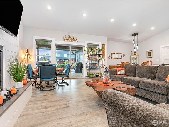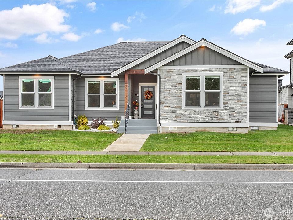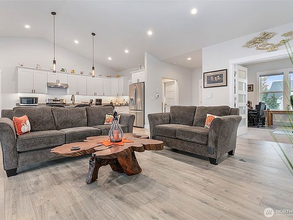 Better than new! Beautiful 2022-built home in Berryman Estates, ideally located near schools, parks, and shopping in Lynden. This spacious one-level home offers over 2,000 sq ft with 3 large bedrooms plus a dedicated office with French doors. The open-concept layout features vaulted ceilings, a gas fireplace, and a stunning Quartz kitchen island. The primary suite includes a luxury bath and oversized walk-in closet. Additional highlights: walk-in pantry, mud room, laundry room, and a large covered back deck. Fully fenced backyard with in-ground sprinkler system and 2023 custom-built shed. No-step entry and move-in ready. One-year home warranty included at closing.
