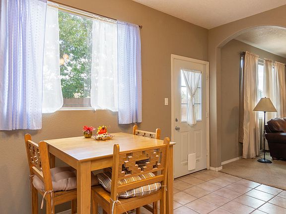 This former DR Horton model home has been meticulously cared for by the original owner. Plenty of space on the beautiful kitchen solid surface countertops. Gas stove with range hood and large pantry. Refrigerator, washer and dryer stay! Storage abounds throughout this well appointed townhouse. Possible 2 master bedrooms upstairs with spacious loft in between. Picturesque view of the Sandias from the North master bedroom. Convenient 1/2 bath downstairs. Private, easy to maintain backyard.