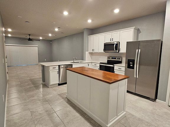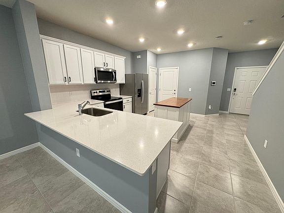 This stunning 3 bedroom 2 bathroom townhome, built just last year, offers the perfect blend of modern comfort and stylish design. Nestled in a highly sought out area, just steps from the pool, boasts fresh paint, ceiling fans, volume ceilings, a gourmet kitchen with a sleek island, quartz countertops, stainless steel appliances, and ample cabinet space. The three cozy bedrooms with luxury laminate flooring make for added comfort, a primary suite with an ensuite bathroom features dual sinks and a luxurious glass shower. More convenient features like custom shelves in the primary closet, a screened in back porch with one way privacy glass tint leading to the outdoor patio. The garage comes with ceiling storage racks and is currently being used as a bonus garage gym with custom mirrors, rubber flooring. Keep it or remove it, you choose, the seller will restore it as a fully functional garage. HOA includes lawn/irrigation, pool and playground maintenance . Located 2 minutes from I-4 and 1 mile from Posner Park with plenty of restaurants and shopping. Approximately 15 minute direct path to Disney. Don't miss your chance to own this impeccable townhome - schedule a showing today and make Bell Haven your new address!