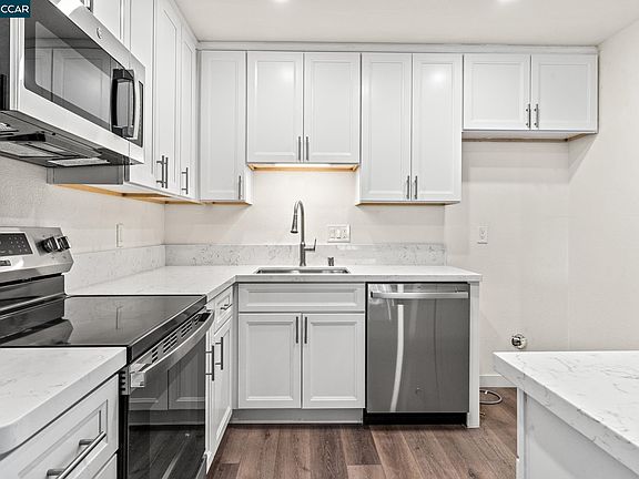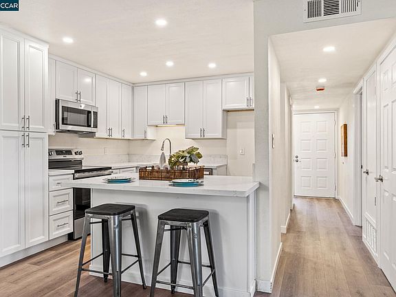 This three-bedroom, two-bathroom townhome-style condo offers a bright, modern living space with a focus on simplicity and functionality. The kitchen features a clean, contemporary design with white shaker-style cabinets, accented by sleek silver hardware, providing ample storage space. Quartz countertops offer a fresh and airy look. Stainless steel appliances, including a built-in microwave, oven, and dishwasher, contribute to the modern aesthetic. A central island serves as a breakfast bar, with space for two stools, ideal for casual dining or extra prep space. The warm luxury vinyl flooring contrasts beautifully with the white cabinetry, adding depth and warmth to the space. The open-concept living and dining area is spacious, with vaulted ceilings enhancing the airy feel. A large window near the dining area lets in plenty of natural light, creating a bright and welcoming atmosphere. The neutral walls and expansive flooring continue the modern, minimalist theme, while a contemporary chandelier provides elegant lighting over the dining space. The layout offers flexibility for arranging the dining and living areas to suit various styles and needs. This townhome offers a modern, low-maintenance space ideal for both everyday living and entertaining.