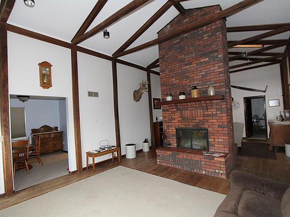 Wow! Freshly refinished hardwood floors; clean & neat! Large, open LR w/beamed cathedral ceiling w/2-sided fireplace. Updated baths, large kitchen, dining room & office/5th bedroom. Scenic views! Finished LL w/attached 4th bedroom. Oversized garage, chicken coop & shed. Raised garden beds & fruit trees. Fenced yard w/firepit. Larger than it looks!