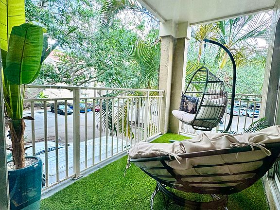 Second-floor unit with private balcony, outdoor furniture, and synthetic turf