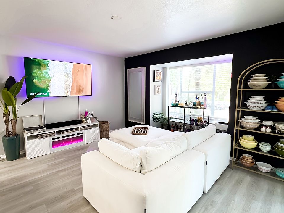 Just bring your toothbrush! This condo comes fully stocked with dishes, linens, and everything you need to move right in. Think of it as a long-term vacation rental where modern coastal meets eclectic fun.