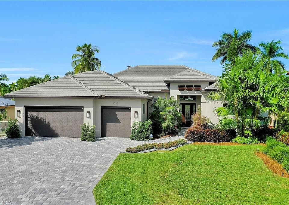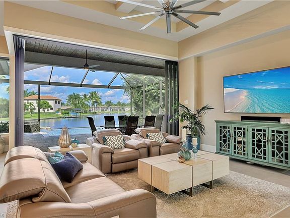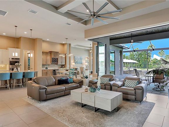 Welcome to this stunning, 2017 custom built home. Located just 5 minutes to the river on a sailboat access intersecting gulf access canal, with breathtaking basin views. This home has everything the discriminating buyer may want. Impact windows and doors of course! Upgraded light fixtures, plantation shutters, custom closets, 4 bedrooms plus office with built in desk, 3 full bathrooms and a 3 car garage with electric roll down screens. The island kitchen with double wall oven, walk in pantry and bar with wine chiller is a cook's dream. Add in the 5 burner gas cook top via buried 500 lb propane tank that also feeds the fire pit and negative edge pool & spa heater for true luxury living. Outside, the expansive view is second to none from the spacious lanai with summer kitchen. The waterfront features a large brick paver area, composite wrap around dock with 14,000 Lb lift with cover that will accommodate a 30' boat. You've been waiting for a home like this and here it is! This one is a must see. Make your viewing appointment today.