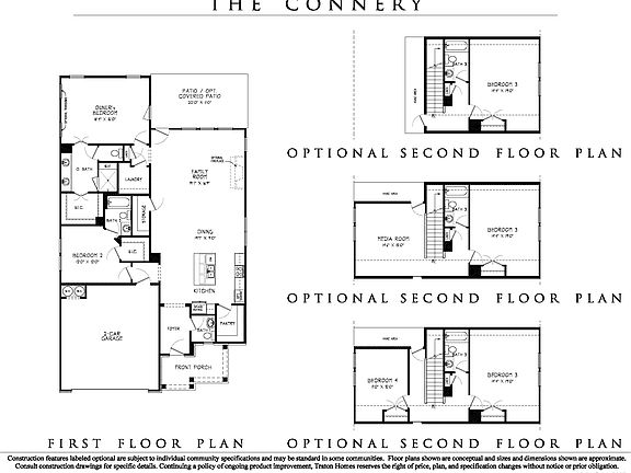 This gracious, open floor plan truly embodies a casually elegant lifestyle. Featuring 10-ft ceilings throughout, well-appointed living spaces include a gourmet kitchen with a spacious walk-in pantry and a large kitchen island. The luxurious owner's suite features an elegant bath with double-bowl vanity, tiled shower, and walk-in closet. The family room offers views of the rear courtyard patio, perfect for relaxing or entertaining. The split bedroom plan offers a guest suite with its own en-suite bath and walk-in closet. A powder room, storage closet and conveniently located laundry room complete the home. For even more space, an optional second level offers up to 2 additional bedrooms with a full bath; or a bedroom, bath and media room combination.