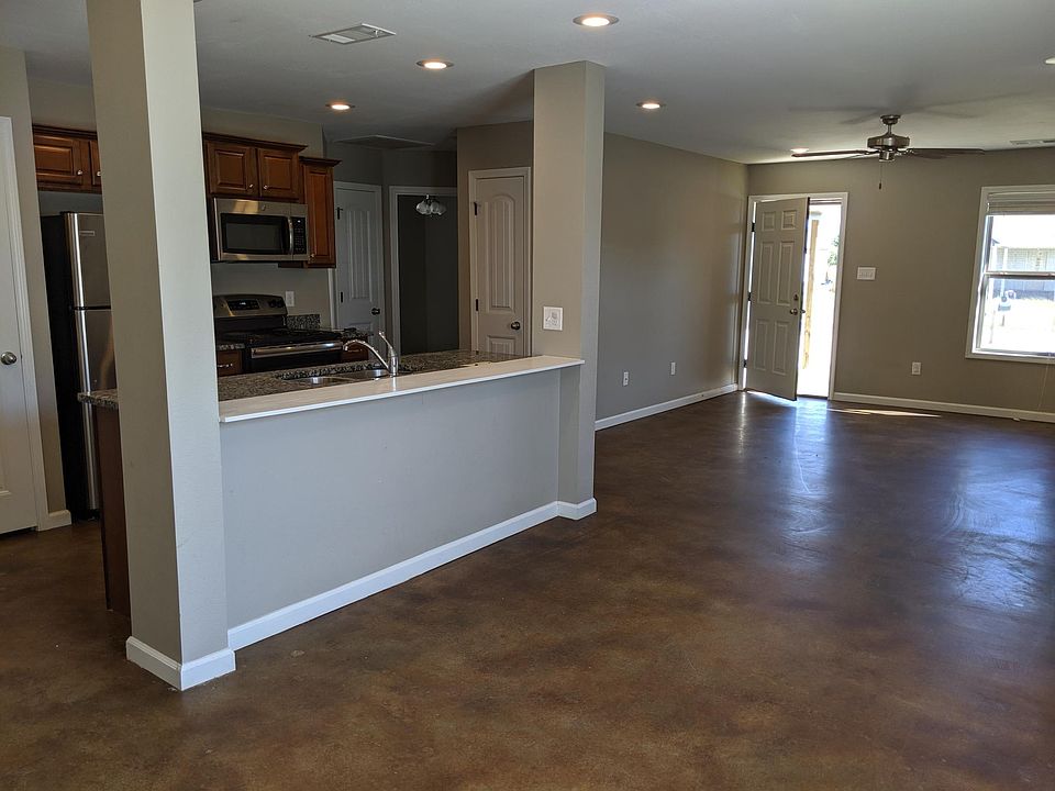3 Bedroom 2 Bath home with carport. This home features an open floor plan, acid stained floors, granite counter tops, and stainless appliances. It has a laundry room with a washer and dryer hookup and a pantry in the kitchen. Fenced back yard. Tenant responsible for utilities and lawn care.