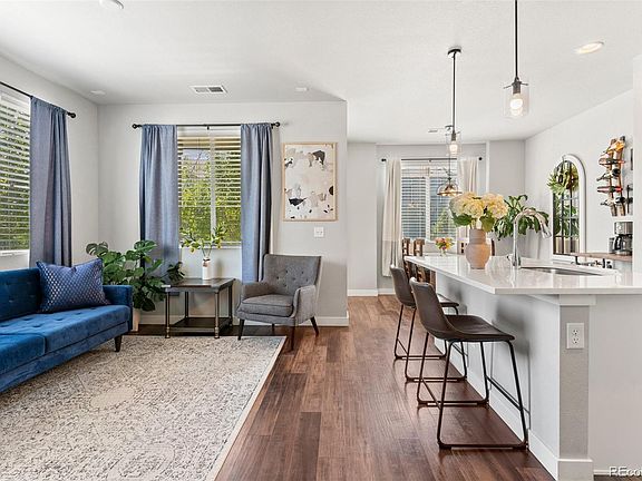 You can’t buy happiness, but you can buy a turn-key, contemporary home in Denver’s hippest suburban neighborhood for under $600k, and that’s pretty much the same thing! Welcome home to this spectacular three bed, three bath townhome situated on a quiet corner lot in Midtown! You’ll have extra time for the things you enjoy with maintenance-free landscaping. Nine-foot ceilings and tons of windows allow for optimal natural light. Beautiful upgrades throughout include new lighting, luxe window coverings and shades, handsome custom-made built-in shelving. The kitchen features a quartz island, stainless steel appliances, and a pantry. An electric fireplace in the living room with a custom mantel keeps you cozy and carefree. Upstairs, the primary suite beckons with beautiful French double doors and South facing private balcony so you can soak up the sun. The primary ensuite bath features a stylish sliding barn door entry, spacious walk-in closet, and a 5-piece bath with double vanity. Two additional bedrooms and a full bath are just down the hall, separated by a bright and sunny loft to afford additional privacy and space. The loft doubles as the perfect office nook, providing a dedicated work from home space. Enjoy a close-knit social community plus all the urban convenience of living only 13 minutes from the heart of Downtown Denver. Just 5 minutes north of Sunny Side, Midtown’s many amenities include a Trailside K-8 elementary school, Montessori preschool, Bruz Beers craft brewery, and miles of parks and trails, plus two RTD light rail stations, bus routes, and easy access to I-36, I-25 and I-70. **BE SURE TO VIEW SUPPLEMENTS FOR A 1% INTEREST RATE REDUCTION FOR 1 YEAR THROUGH LENDER