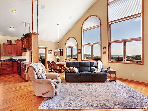 Close to town but worlds apart, this quality custom stucco retreat is privately situated on 35 level and rolling treed acres. The first thing you will notice is the stunning wrap-around deck that leads to the inviting entrance. Inside you will be greeted by real hardwood floors illuminated by soaring windows, showcasing an amazing, picturesque view of the mountains & valley beyond. Marvel at the updated gourmet kitchen offering ample storage & expansive live-edge granite countertop & touchless faucet. The informal eat in dining room is separated from the kitchen by a row of pass through glass door cabinets repeating the architectural style with the Low-E insulated windows they face. The vaulted living room hosts an entertainment center, gas fireplace & towering windows overlooking the expansive view. Off the kitchen is a separate formal dining room featuring a crafted wood inlay floor and double entrance. Next is a large office/sitting room with French doors, built in shelving and peaceful window bench perfect for contemplating life. Ideal for main level living the spacious main bedroom suite provides a serene escape with adjoining full bath, walk-in closet & walk out to a private rear deck. Also on the same level, is the full sized laundry/mud room & unique retro 1/2 bath. The upstairs loft provides yet more views, a built-in & lighted display cabinet, a great seating area & additional full wall storage. The sunny walkout lower level offers 3 spacious bedrooms, a huge media area-family-game room, wet bar and full bath. Perfect for guests and/or multi-generational living. The back room has a sink & is perfect for hobbies/crafting & has a hidden walk-in safe. Cozy radiant in-floor heating on all 3 levels with Central Vac. Heated 3 car oversized garage with workbench, compressor connection & 910 3rd bay door. There are no covenants, Only 20 minutes N to downtown Colorado Springs, 15 min to groceries and 15 min S to Brush Hollow Reservoir.