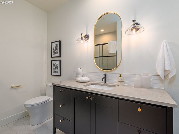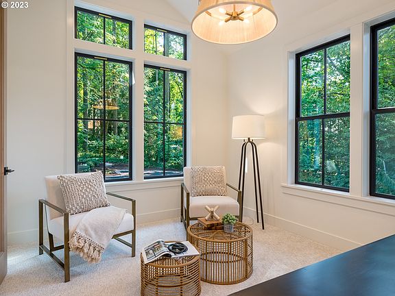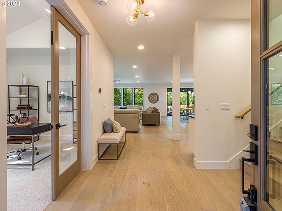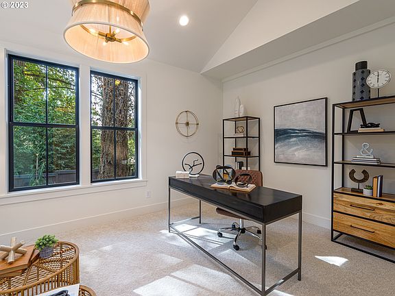Experience contemporary living in Lake Oswego's Palisades neighborhood with this magnificent new construction by the renowned builder, Blue Palouse Properties. This property is nestled at the end of a private drive in a picturesque park-like setting. Impeccable design and meticulous attention to detail create the perfect blend of comfort and elegance. As you step into the home's expansive foyer, you're greeted by the oversized great room floor plan. With its 12? ceilings, engineered hardwood flooring, and a cozy fireplace flanked by wall-to-wall cabinetry, the great room offers a welcoming ambiance. Seamless flow into the informal dining room and the gourmet kitchen, featuring a remarkable 15? island and a convenient prep kitchen with ample storage and a walk-in pantry. This chef's dream kitchen boasts high-end stainless steel Decor appliances, exquisite lighting fixtures, and a stylish mix of black and gold accents, complementing the contemporary design. Outside on the covered outdoor patio, you will find the warmth of the fireplace while relishing the privacy and sprawling lawn with meandering paths to explore. The main level also features a generous office space with vaulted ceilings and an abundance of windows, allowing natural light to flood in. Upstairs you?ll discover a vaulted master suite, with double closets and a spa-like bathroom. The sizable bonus room can serve as a fourth bedroom or game room depending on your living style and needs. Every room in the house is equipped with generous walk-in closets and spacious hall bathroom. Storage is abundant, providing ample space for all your belongings. Enjoy four Lake easements: Alder, Maple, Blue Heron, and Lakeview Recreational Park. The home is situated in the excellent Lake Oswego school district, and its walkable location offers easy access to restaurants and the lake.