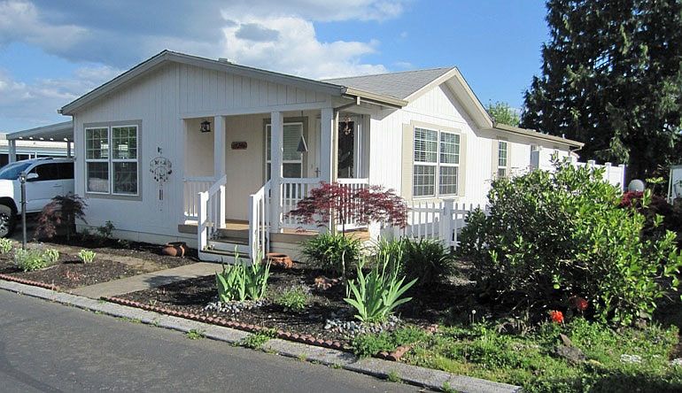 Amazingly well kept 2004 Goldenwest in premier 55+ Community! Home features vaulted ceilings, tape & textured walls throughout, vinyl windows, wood cabinets, lots of storage, & more! Enjoy your morning coffee on the covered front porch. Kitchen has newer appliances, wood cabinets, & nice laminate counters with tile edging, & back-splash. Both bathrooms have walk-in showers. ceilings fans in all bedrooms & living room. 2nd bedroom was converted from 2 into 1. Perfect for a separate sitting room off the master or easily convert it back to a 3rd bedroom. Eat-in kitchen as well as a separate dining/breakfast nook. An excellent home! Comes with all appliances including washer & dryer. Yard: Beautiful front & back yard with mature landscaping & vegetable gardens. Side yard is fenced for a small dog. 17245 SW Eldorado Dr, Tigard. #14124