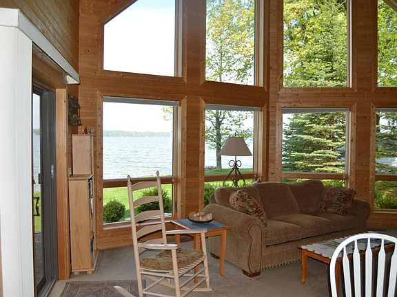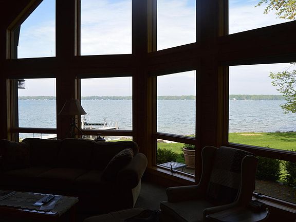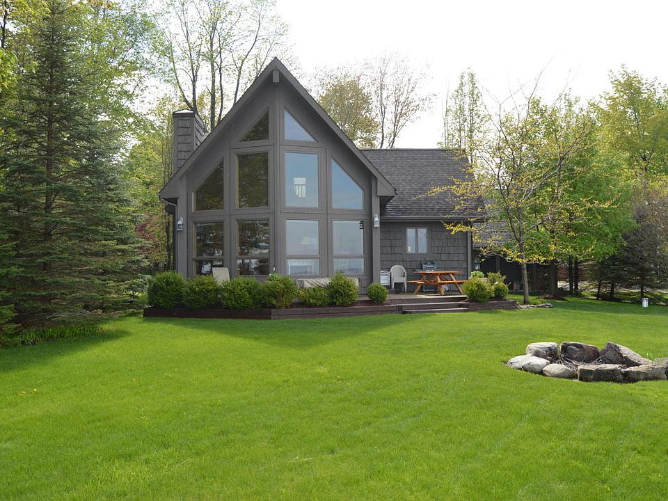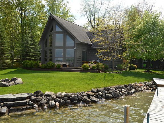 Beautiful summer chalet located on the shore of Long Lake, 123 ft of shoreline landscaped with several varieties of trees, shrubs , annuals and beautiful lawn, which leads to the waters edge. The interior boasts 22 foot ceilings with the interior being finished with white pine and the dry wall areas finished with knock down texture. This home was custom built with attention to detail which shows in every area that is seen. Extensive use of glass is used to show case the yard , front brick paver patio and lake. The exterior is finished in full thickness Western Cedar shake with all trim in Cedar also. The detached garage is 2 1/2 car, and is finished to match the exterior of the home, It also offers a loft for storage, a covered porch facing the lake for use on inclement days. The lower level of the garage is insulated and finished.