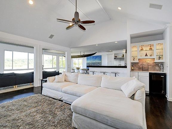 Amazing views of the Ohio River in this custom built 4 bedroom 3 full bath 15 year old home in Oldham County with 100 feet of riverfront beautifully landscaped with an additional 75 feet of lawn and parking across the road. When you enter you will be overwhelmed how this open floor plan which takes advantage of the WOW view! There is a greatroom with hardwood floors, coronado stone fireplace, vaulted ceiling, wet bar, and a sunroom - all open to the kitchen area, with hardwood floors, white cabinets with Italian gourmet inserts, breakfast bar, recessed lighting, new appliances and a large eat-in area...What a kitchen for entertaining! The master suite has sliding glass doors onto the deck overlooking the river, trey ceiling, 2 way tiled fireplace, and recessed lighting. The master bath has a jacuzzi tub, separate shower, ceramic tile and large vanity. There are 3 additional bedrooms, full bath and laundry on this 2nd floor. The first floor has an enormous family room with 16 foot ceilings, (Ask about the basketball goal!) game area & full bath. Step out the sliding glass doors to a beautiful patio and extensive decking 61'X12', 30'X12' is covered. This home also has a 4 car oversized garage with carriage house doors, and rear riverside garage door entry, security system, energy efficient heat, outdoor "beach" shower, custom upper and lower decking, private boat dock and many upgrades and extras. There is a private 12'X 19' boat dock. In the past 12 months, income from using it as a B&B has exceeded $30,000. The seller has made huge improvements ($150k) which include: new epoxy on floor, new mezzanine, 5 new window sashes, new lighting, complete re-do of the basement: new metal walls and lighting, new custom cable and wood stair railings, All painted, kitchen cabinets refinished, new countertops and appliances, new decking on dock, custom bar in kitchen. Approximate costs: Water $30/mo, LG&E $224/mo, Lawn $200/mo, flood insurance $1,200/yr. Please understand that showings have to work around Airbnb customers.