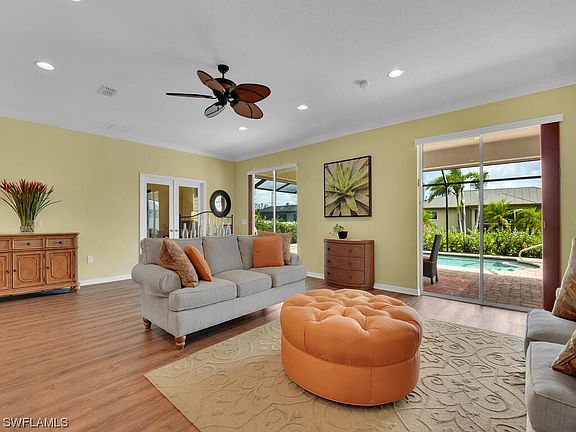 Welcome to this 2017 custom built Home in SW Cape Coral! At almost 2000 sq. ft. this home features 3 bedrooms & 2 full baths with a den and ***all assessments have been PAID! The home is being OFFERED FURNISHED with TOMMY BAHAMA FURNITURE & window coverings by HUNTER DOUGLAS! On arrival, you will notice the upgraded pavered driveway, real brick facade & screened entry way to keep the bugs at bay. Beautiful light fixtures & luxury ceiling fans throughout. Gorgeous luxury vinyl plank flooring & crown molding throughout main living areas. The open kitchen features a large pantry, pendant lights, SS appliances, luxury granite countertops with a modern tile backsplash that brings it all together. Huge master bath shower features multiple shower heads & dual granite sinks. Bedrooms are good size & offer plenty of natural sunlight. The heated Saltwater pool has a large sitting area under cover for summer storms. This home is equipped with 4 electrical lanai shutters & manual accordion shutters for storm protection, easy to close & go! Pool area has a 2"concrete pad under the pavers, no weeds, or sagging pavers:)Lots of deck space for entertaining! Great location, close to schools, shopping & beaches!