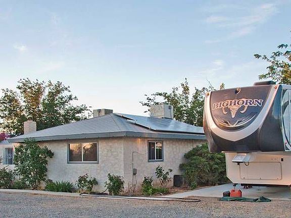 Gorgeous Pool Home on 1.25 acres close to city limits zoned for horses. Front garden patio leads to this 3 bedroom 2.75 bath home. Large Master suite with walk in closet. Master bath has tile surround and heated floor. Bright and cheery kitchen with Quartz counter tops that opens to a spacious dining/family room with wood burning stove. French doors lead to covered patio, pool, and spa. Separate living room with fireplace.Tile Floors in Entry, Hall, Kitchen, and Baths. Large laundry room with plenty of storage. Three car garage and a two car detached garage. Greenhouse with attached evaporated cooler. RV Pad with hook ups and a 30 amp service. Two Master Cools, 6K solar system with assumable lease. Newer Trane forced air furnace that can be converted to a dual pac. Check out this move in ready home today!