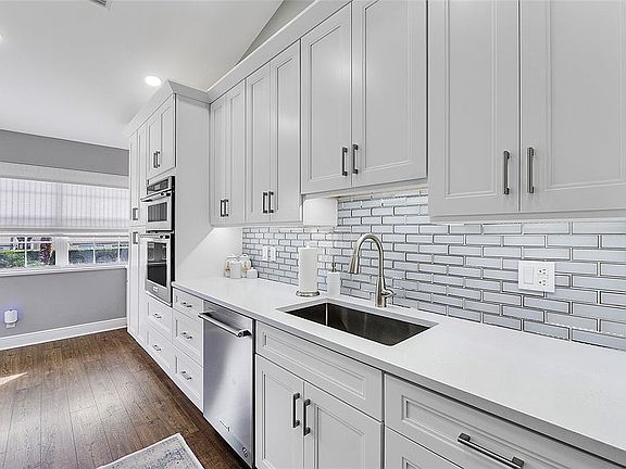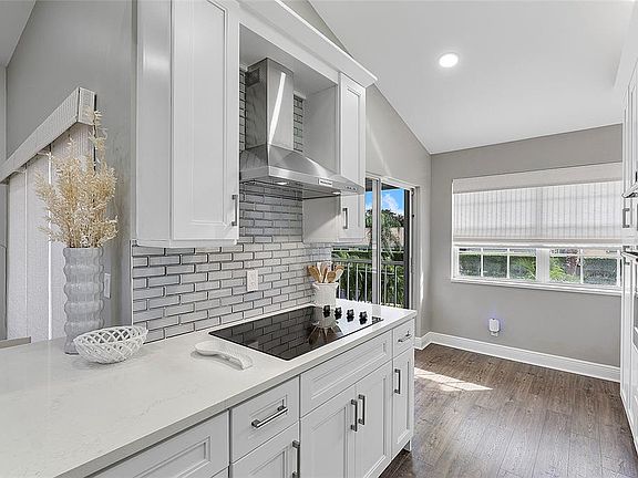 The kitchen features beautiful Shaker wood cabinets with crown molding and Quartz waterfall countertops with subway-tile backsplash. New high level Kitchen-Aid SS appliances make this kitchen with roll-out pantry's and soft-close drawers a Chef's paradise. Hardwood Laminate flooring is throughout the unit & provides a nice contrast to the shipboard wall accents in the Living Room. Motorized custom window shades can adjust lighting with a click ! The 55-inch Samsung frame series TV is perfect for the big game or blockbuster movie. No popcorn on these vaulted ceilings. 2018 AC, 2021 WH, Pool is a short walk. Close to shopping, beach and A-1 schools.