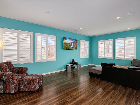 Lovingly maintained and thoughtfully upgraded, this two-story Reunion home is sure to impress! A contemporary, 4-Lite front door opens to reveal a light-filled foyer with towering double-height ceilings and vinyl plank flooring. The versatile layout flows into an open-concept living space enhanced with recessed lighting, eye-catching accent walls and plantation shutters. The well-appointed kitchen showcases espresso cabinetry, sleek stainless steel appliances and a granite center island with seating. In the adjoining dining nook, a sliding glass door opens to the backyard patio, extending your living space and entertaining potential! Upstairs, the master suite delights with plantation shutters, a large walk-in closet and an en suite bathroom. Even more square footage awaits in the finished basement that includes a wet bar, guest bedroom, ¾ bathroom and spacious rec room. Discover an entertainer's paradise in the spacious backyard! This fully-fenced retreat features a sprawling lawn, outdoor speakers, plus ample space for a grill, firepit, water feature and more. Reunion provides a multitude of community events, including movie nights, yoga, Trunk or Treat, a farmer's market and more! Enjoy easy access to Reunion Park, Reunion Recreation Center and Buffalo Run Golf Course.
