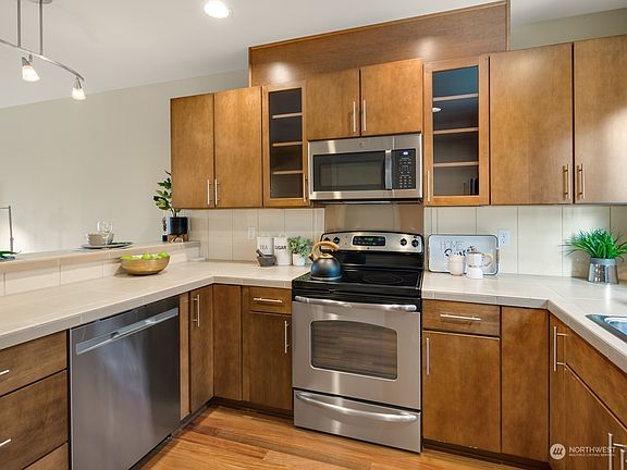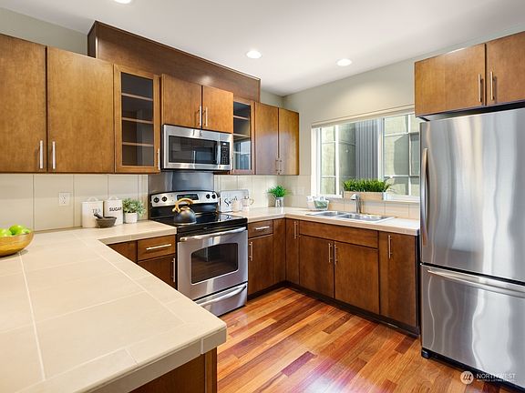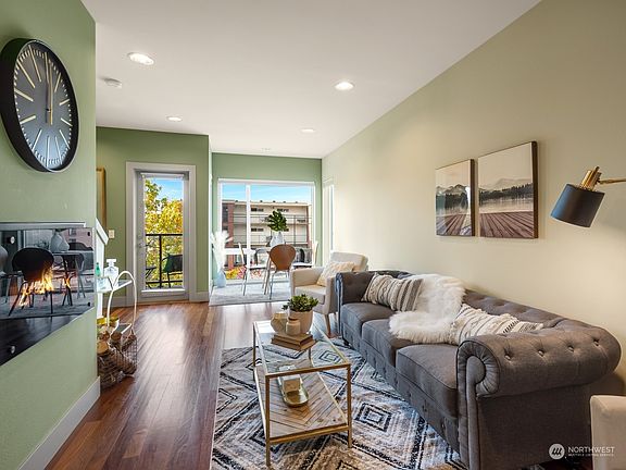 Sun drenched west facing townhome sits atop north Beacon Hill! Close to all that downtown has to offer- award winning restaurants, shopping, stadiums, entertainment & light rail. Spacious floor plan with office / 3rd bedroom, patio & 1 car garage on entry level. Main floor boasts warm hardwoods, big windows w/ cityscape views, living /dining, generous kitchen w/ newer appliances, powder room, fireplace & deck that is perfect for your evening beverage. Top floor boasts primary bedroom, sunset Olympic Mountain & Elliot Bay views, vaulted ceilings, laundry closet, skylight, 2nd bedroom + 3/4 bath. This home provides an idyllic urban landing pad for a fun & vibrant Seattle lifestyle.