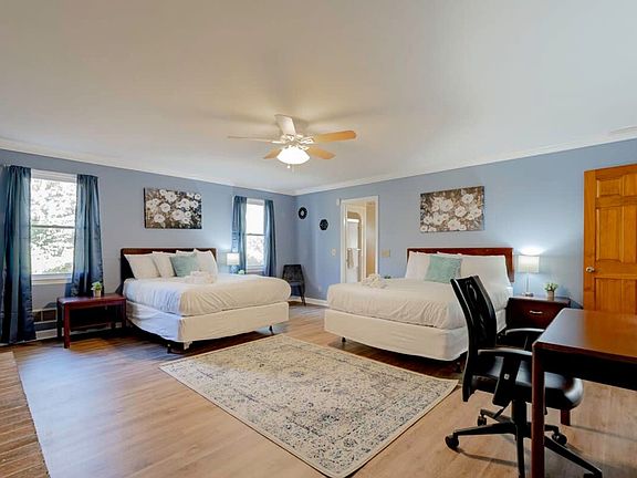 Welcome to the Sweet Retreat in Columbia, SC! Just minutes from Downtown, this spacious home accommodates 12 guests with a full kitchen, two dining areas, two living rooms, and a foosball table. Feel at home with easy access to Riverbanks Zoo, USC, and vibrant shopping and dining. The property is set on a semi-private pond and features a large yard and a spacious porch with a charcoal grill. Step into our spacious and pet-friendly home through the front door code and into the inviting foyer. The front bedroom offers a king bed and ensuite bathroom. The main living room, accessible through the front bedroom, features two sleeper sofas, a large SmartTV, and abundant natural light. A dining table for six and a fully equipped kitchen with eat-in dining for four are also available. A few steps up, you'll find the den area with a foosball table and two more sleeper sofas. The last bedroom features two queen beds with backyard access, while the master bedroom comprises a queen and a full bed, complete with a desk and an ensuite bathroom with a spacious shower and double sinks. A pack 'n play/travel crib is available upon request. We are a pet-friendly home. Pets must be crated when left unattended and are not allowed on furniture or beds. All pets require a non-refundable pet fee. If there is evidence of pet hair on the furniture, excess hair in the home, stains, or waste found in the yard or home, you will be charged the cost to clean this. Welcome to our charming residential neighborhood nestled near Broad River Road. Discover a tranquil oasis just minutes away from the bustling energy of Downtown Columbia. Immerse yourself in the vibrant culture with convenient access to popular attractions like Riverbanks Zoo, the prestigious University of South Carolina, and a plethora of exciting shopping and dining options. Unwind in our welcoming home while still being within reach of all the excitement the city has to offer. This home is located on the north side of West Columbia, with Uber, Lyft, and other taxi services available, though driving is encouraged. Parking is available in the driveway for several cars. Smoking and parties are not allowed. The house has a digital keypad at the front door for access, with the code provided upon check-in. Enjoy full and private access to the home. We offer contact-free check-in via a digital door code and are only a phone call away if needed. Note that the home used to have an interior hot tub in the living space, which is no longer functioning and is covered. This will not impact your stay. The master bedroom includes a desk for your convenience. A laptop computer is not included.
