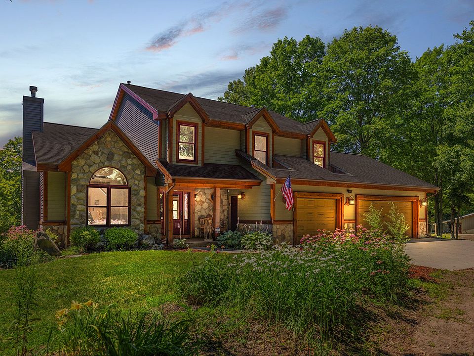 Executive home on the hill. Home is situated on 20 acres with deeded access to all sports West Lake. Located close to Boyne and Gaylord. The kitchen features a dual cooper sink, hardwood floors, stainless steel appliances and open to the dining area and family room. Enjoy your family room with a fireplace and stunning views of your estate and outdoor fireplace. Your living room is surrounded by windows with breathless views to enjoy your morning coffee by your fireplace. Up your wooden stairs you will find 3 spacious bedrooms and 2 full baths. The finished basement features a walk out, theater/bedroom. Detached office has entertaining area, high speed internet, 5th bedroom and exercise room. Trails throughout the property, elevated deer blind w/elect, numerous fire pits.