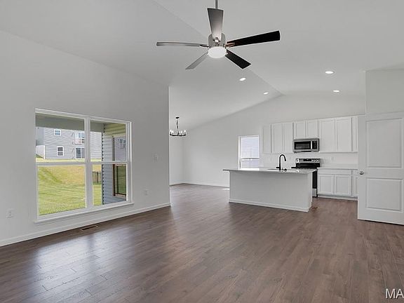 New McBride Homes' Aspen II 3BR 2BA ranch is READY! An open floor plan with vaulted ceilings, 6ft windows, & beautiful wood laminate flooring throughout main living areas. The kitchen has a large island w/ breakfast bar, level 4 painted white 42” cabinets, quartz countertops, stainless steel GE appliances, & large walk-in pantry. The dining area has a sliding glass door to a covered patio prewired for a ceiling fan & future finish. The master suite has a large window, dual closets, & private master BA w/a double sinks & walkin shower. Other extras include main flr laundry, LL with a ¾ bath rough in, 2 panel interior doors, upgraded lighting/plumbing fixtures & coachlights at garage. Polo Grounds has a barn-style clubhouse, playground, pickleball court, fire pit, scenic lake w/fountain & more. Located in Eureka near Highway 109/Hwy FF, in the Rockwood School District. Enjoy peace of mind w/McBride Homes’ 10 year builders warranty & incredible customer service! Similar photos shown.