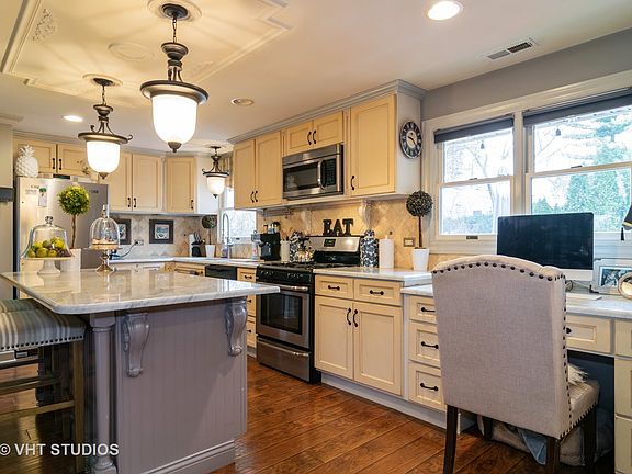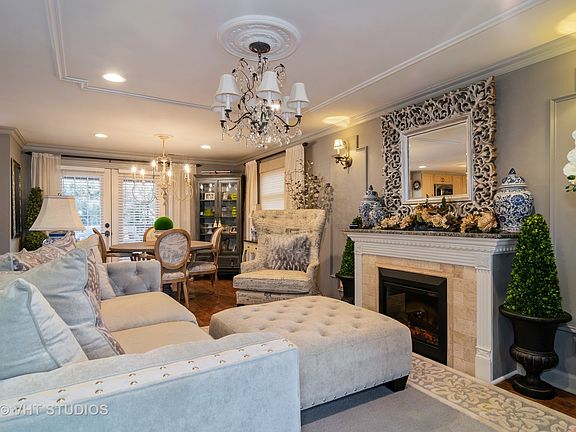 Custom decorator finishes are the hallmark of this updated 3 bedroom, 2 bath, open concept ranch. Wide plank wood floors, crown molding, wainscot, wall scones, & decorative chandeliers give the home a custom look. Cook's kitchen features Stainless Steel appliances, large center island with Quartz counter tops, and planning desk. Living room with electric fireplace is adjacent to the dining room with French doors to the deck with Pergola and large fenced yard. Master suite features walk in closet, electric fireplace, and custom bath with marble floor, tub with ceramic surround, and rain shower. Two additional bedrooms are serviced by the hall bath with marble floor, farm style vanity, and shower with ceramic surround. Located steps from Eileen Bond Park.