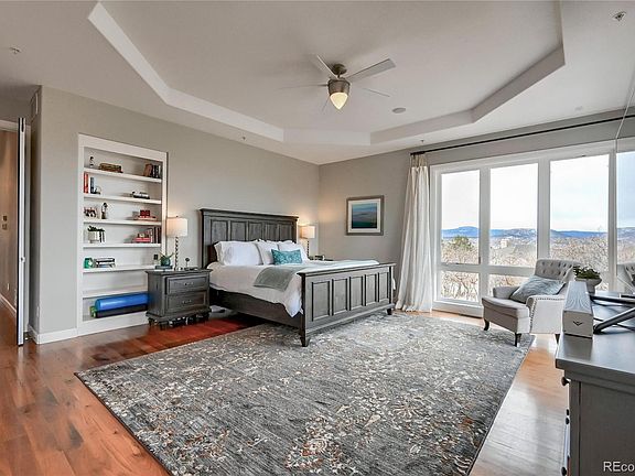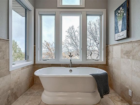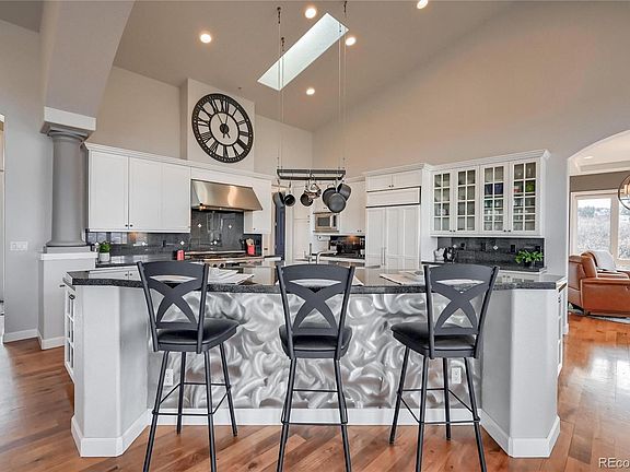 Enjoy luxury living... in style... with this architecturally beautiful home. Soaring ceilings, skylights, and 8-foot doors feature attention to detail while floor-to-ceiling windows with views spanning the Frontrange offer serenity in abundance. The chef's dream kitchen is complete with slab granite countertops, stainless steel island top, a SubZero refrigerator, and a 6-burner Dacor range plus double ovens & separate warming oven for the ultimate cooking experience! Step into the primary suite which boasts an exquisite custom closet, walnut floors, and a relaxing, decadent, pedestal tub. Prepare meals outdoors on your composite deck featuring spectacular views while enjoying music from its outdoor audio system. The two laundry rooms offer flexibility and there is an abundance of convenient storage plus a gym/study room and a library! This energy efficient property features 2 furnaces & 2 water heaters.