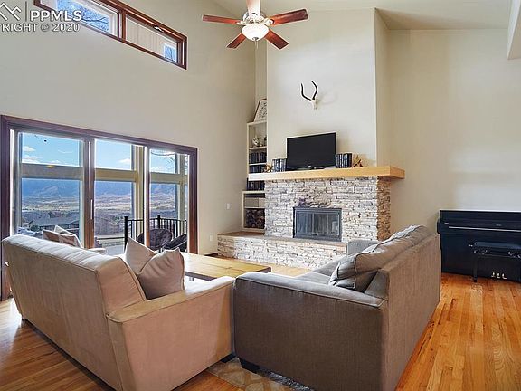 One of a kind Colorado Contemporary 3 bed, 3 bath ranch in desirable Woodmoor. Exceptional lot with Pikes Peak views and spacious fenced backyard. Incredible sunroom has a wall of windows that runs the length of the home; the perfect place to enjoy sunsets over the Front Range. Great single level floor plan with vaulted ceilings, hardwood floors, and open great room, kitchen, and dining room. Entertainer's kitchen with quartz counters, oversized island, breakfast bar, double oven, and gas range. Bright great room has a stone wood-burning fireplace and walk-out to the sunroom. Master suite offers an oversized walk-in closet and attached 5pc bath, soaking tub, and heated tile floors. Private second suite has room for a sitting area or office space and has an attached 3/4 bath. Home is completed by a third bedroom with soaring ceilings, shared 3/4 bath with spa shower, and laundry room. Large concrete patio with fire pit is perfect for enjoying warm Colorado weather and taking in the sweeping mountain views.