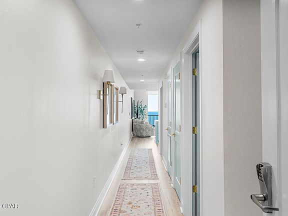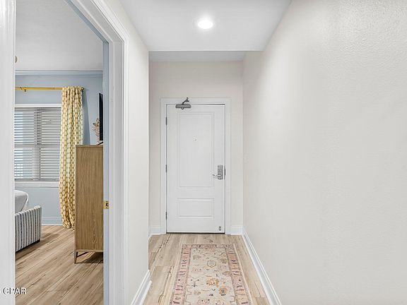 When you walk into Palazzo, Unit 1105, you will immediately note the attention to detail in every room of this exquisitely remodeled condo. From the luxury vinyl plank throughout, to the updated solid wood doors and trim, to the baths' shiplap walls, this condo is a must see. The living area is equipped with remote, motorized blinds for easy balcony access and gulf viewing. Luxury, high end furniture with a sofa sleeper complement the room. The kitchen is designed for both functionality and entertaining with slow-close cabinet drawers and doors and a white, waterfall quartz countertop and backsplash. The high performance CAFE' appliances are equipped with WiFi Connect that puts all your kitchen functionality right in your hands. The bunk room is outfitted with a daybed and additional pull out mattress. The guest bath features a new tiled shower, new fixtures throughout, a quartz countertop, and a bidet. The master bedroom has all new furniture including a king-sized bed. The shiplapped master bath has a full length ornate tiled shower, new fixtures throughout, and a quartz countertop. Updates to the HVAC were in 2022, to the water heater in 2024 and a new washer/dryer. Add to that the Palazzo's amenities: heated pool, hot tub, fitness center, under-building parking, on-site security personnel and cameras. With all of this and the close proximity to McGuire's Pub and Pier Park,... Palazzo 1105 has it all.