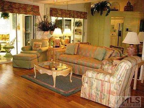 Magnificent panoramic views of water and golf course. Beautiful wooden flooring. Up-stairs end unit is open and light. Screened porch with plexiglass sliders. Custom built-ins in the third bedroom/office. Landscaped community pool, spa and park.