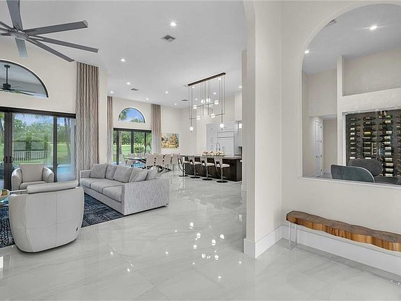 Furnished remodeled 3-bedroom pool home with no steps. Furniture was selected by a professional designer. Impact windows & doors. Large gourmet kitchen. White 2x4 porcelain tiles throughout main living areas. Open floor plan that is great for entertaining. Bar with cooler built-in. Luxurious wine room with refrigerated wine wall. High ceilings throughout Great room. Primary Bedroom is very spacious. Primary bathroom has dual sinks, free standing tub to incredible walk-in shower with amazing decorative tiles. 2.5 bathrooms inside & cabana bathroom outside. Oversized backyard with refinished pool and breathtaking views of the golf course. 2 car garage & side golf cart garage. Roof 12 years old. House is being sold furnished. Artwork, Sculptures, Accessories & Wine are not included in sale. Furnished remodeled 3-bedroom pool home in St Andrews Country Club. House has no steps. Impact windows and doors. Large gourmet kitchen