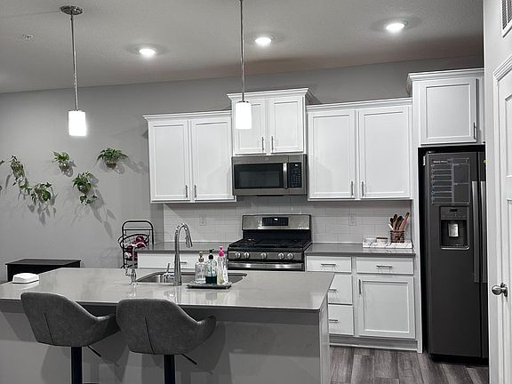 Spacious & light-filled, three-levels with unfinished walk-out basement, rowhome-style with large windows front & back. Open main level floorplan with 2-story foyer, 9-ft. ceilings, electric fireplace and deck. Designer kitchen with white cabinetry, quartz countertops, slate-finish appliances, gas stove, center island, backsplash, pantry & more. Upper level features three bedrooms, two bathrooms & laundry room. Spacious owner's suite with large walk-in closet and private bath with 5-ft. walk-in shower & double-sink vanity. Unfinished lower level/basement with walk-out to back yard. Two-car garage. Convenient to shopping, schools, recreation & more.