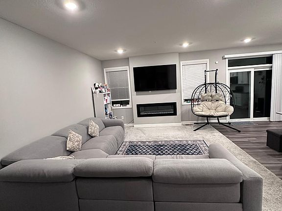 Electric fireplaceCenter islandTwo bathroomsOpen main level floorplanLarge windowsThree bedroomsSlate-finish appliances