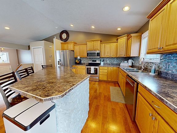 Welcome to your dream home in the heart of Minot! This beautiful split-foyer home offers the perfect blend of style, comfort, and functionality. With 4 generously sized bedrooms and 3 bathrooms, this property is ideal for families or anyone seeking plenty of space to live and entertain. The upper floor features an open concept layout with living, dining and kitchen all in one great room. You'll love the large island in the kitchen and sliding glass door to your deck just off the dining room. There are 2 bedrooms on this level, with one being a primary suite. The primary bath boasts a stunning tile shower with soaker tub, dual sinks, and linen closet. There are his and her closets in the primary as well. A second full bath rounds out this level. Heading downstairs to your daylight basement you'll be greeted by a floor to ceiling gas fireplace and a cozy living room. There are 2 egress bedrooms, a full bath, and nice laundry/storage room to complete the interior of the home. The attached 3 stall garage is fully finished and heated, complete with floor drain, epoxy floors, and workshop. The fenced-in backyard has plenty of storage with 2 sheds, a custom paver built-in fireplace, and deck. This home has everything you need for comfortable living, modern touches, and plenty of space to make it your own. Don’t miss out on this incredible opportunity to own this stunning property - call to schedule your tour today!