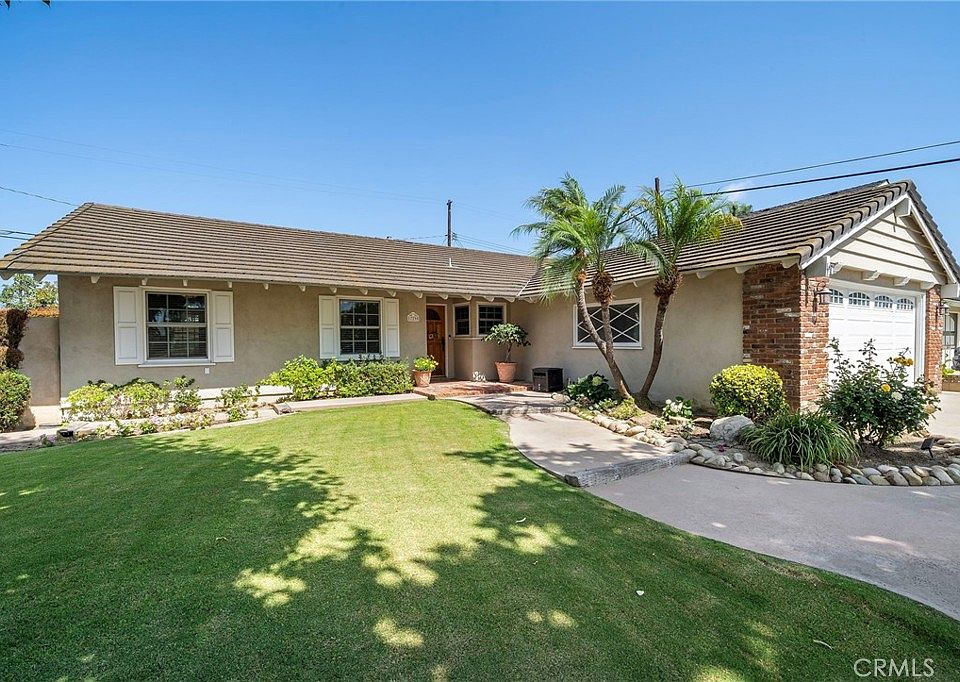 Rarely does a home come along that checks every box—a highly upgraded, sprawling 2,061 square foot ranch-style single story with 5 bedrooms and 2 baths on a prime 8,103 square foot interior corner lot with double RV gates, keypad entry for direct access garage in one of Fountain Valley’s most sought-after neighborhoods! This impeccably maintained, upgraded, expanded Stratford boasts central A/C, dual pane French-style windows, beautiful engineered wood flooring, recessed lighting, raised panel interior doors, ceiling fans in nearly every room, chair railing, custom casements, mirrored closets, upgraded bathrooms, and a gorgeous, completely remodeled chef's dream kitchen. From its charming curb appeal with pristine landscaping, and brick siding and front porch to its open concept sun-drenched floorplan, this home is a true standout. From the lovely entry foyer a pocket door opens to your dream kitchen with coffered ceiling, granite countertops and custom white shaker soft-close cabinetry with under-cabinet lighting, glass display panels, pull-outs, hidden trash, and specialty compartments. It includes a gas cooktop, newer "smart" oven with convection & air-fry features, dishwasher, microwave, and wine cooler, plus a wide peninsula with breakfast bar seating. The kitchen is open to the spacious dining room with garden window and the living room with a gas-log brick fireplace. Adjacent to the living room is a very spacious family room with sliders leading to the tranquil backyard oasis with built-in Granite barbecue center (fridge & Turbo BBQ), bar seating, a raised deck with in-ground bubbling spa, wrap-around lush velvet lawn, and raised planters with manicured gardens - a perfect place for that California outdoor lifestyle for entertaining and relaxing. The oversized primary suite with room for retreat has a brick accent wall, huge mirrored closet, French sliders that open to backyard, and an en-suite bathroom with newer vanity with granite counter and walk-in shower with tiled walls. There are 4 additional bedrooms and an upgraded hall bath with granite countertop, tile flooring, upgraded fixtures, and a tub/shower combo with glass enclosure & tile surround. This superb home is steps to neighborhood park, close to Mile Square park/golf/lake/sports center, top-rated schools, shopping, dining, and just minutes to the beach—this is the rare single-story opportunity buyers have been waiting for!