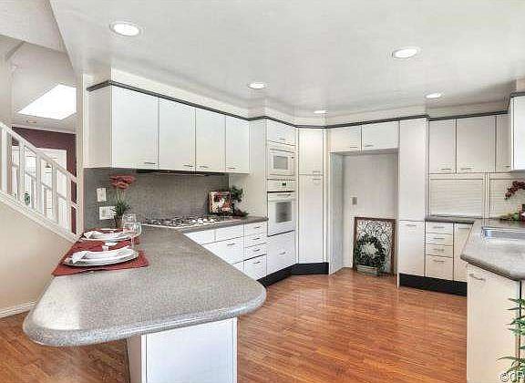 Spacious Pool Home. Light, Bright, Open Flowing Floorplan with 4 Bedrooms (Downstairs Bedroom was Converted to Expand the Downstairs Family Room - Can be Converted Back to Smaller Family Room & Downstairs Bedroom), 3 Baths (1 Downstairs), and 3 Car Garage. Features: Wood Laminate Flooring, Dual Pane Windows & Sliders, Plantation Shutters, French Doors, Crown Molding, Raised Panel Interior Doors and Closet Doors, Double Entry Doors, Foyer with Skylight. Large Living Room with Cathedral Ceiling, Marble Fireplace, & Built-In Book Shelves & Cabinetry with Pull-Outs. Upgraded Kitchen has Corian Countertops, Gas Cooktop, Microwave, Dishwasher, Oven, Recessed Lighting, Stainless Sink, 2 Appliance Garages, & Breakfast Bar.Central air condition. Huge Family Room with Built-Ins. Inside Laundry Room. Large Master Suite with 2 Closets & Spacious Bathroom with Designer Tile Flooring & Surrounds, Dual Sinks, and Separate Shower & Tub. Tile Roof. Inviting Front Flagstone Patio. Extra Large Backyard with Sparkling Pool & Spa, Covered Patio, Lush Tropical Landscaping, and Block Wall Fencing. Close to Neighborhood Park, Beach, Shopping, Restaurants, and Excellent Schools. Great Buy in Great Neighborhood!