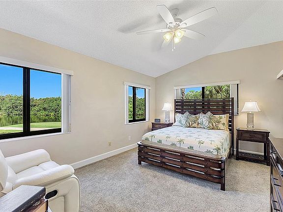 Enjoy gorgeous panoramic golf course and lake views from this rarely available 2nd floor corner unit overlooking the 16th hole. Open concept floor plan with vaulted ceilings and extra windows makes the home light and airy with tons of natural light. Unit is turnkey, featuring hurricane impact doors and windows, neutral color tile flooring and freshly carpeted bedrooms, oversized patio, updated kitchen with eat-in nook, and offered fully furnished. Located in the exclusive gated community of Boca Country Club, and steps from the Fairways subdivision pool and Boca Raton Golf & Racquet Club. Tankless water heater 2023, A/C 2020. Washer and dryer in the unit. Property is wired for security alarm. No club membership required.