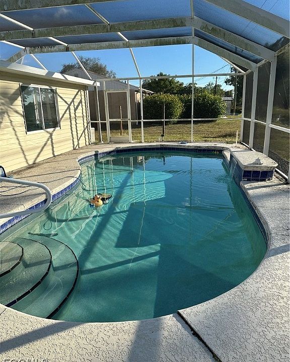 Welcome to your next home! Inside, you’ll find an open-concept floor plan with vaulted ceilings, 3 bedrooms, 2 full baths, and a 2-car garage. A large bonus room off the back of the home offers flexibility — use it as an office, storage space, or add a closet to create an additional bedroom. Recent updates include Shingled roof (installed 12/2022) AC handler and electric garage door (replaced 2024) Water heater (installed 2025) The backyard is made for Florida living, featuring a concrete inground pool with a newer pool cage, and pump with ample space for lounging. There’s also a covered patio with a new roof/ceiling — perfect for outdoor entertaining. Other highlights: Wood flooring throughout except tile in bathrooms. Utility shed for storing pool equipment and tools. Master suite comes with a private bathroom with double sinks and a walk-in closet This prime location is just 7 miles to the airport and 3 miles to Gulf Coast Mall, with top-rated schools nearby — a great fit for families! No HOA! Average rental rates for pool homes in the area range between $2,200–$3,000/month. Bring your creativity and make this home truly yours!