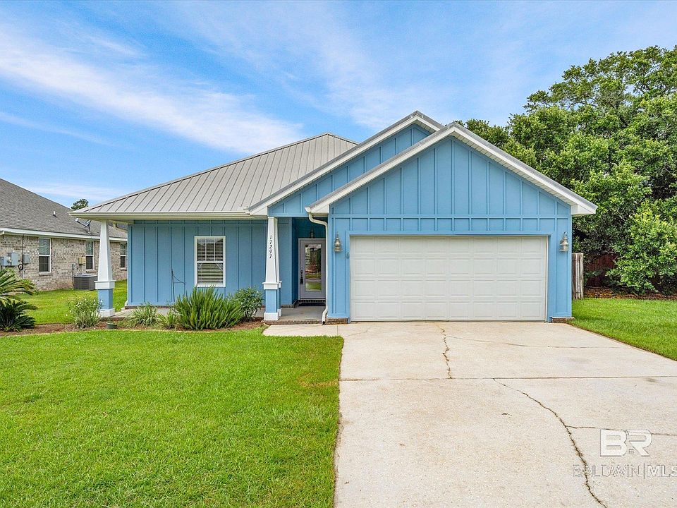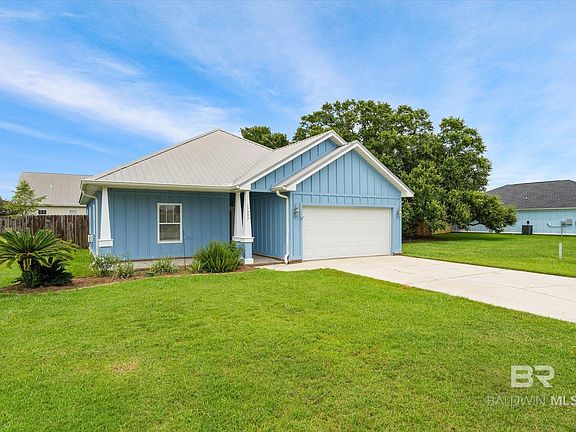 Welcome to this wonderful 3 bedroom 2 bath cottage in Hidden Lakes. Living Area opens to a kitchen that features a breakfast bar and bench seat eating area. Nice size primary Bedroom. Primary Bath has double sinks, a garden tub, separate shower and a large closet. Laundry Room with mud area and bench. Double garage, Metal roof and level fenced yard. This home sits directly across the street from the community pool, BBQ area, stocked fishing pond and tennis courts. Hidden Lakes neighborhood is located in Foley with easy access to the Beach, OWA and the shopping at Tanger outlets too! Come see this cute Baldwin cottage today! Per seller, the lot with the big oak tree next door can never be developed and this ensures a higher level of privacy. Entire exterior of home was professionally repainted less than a month ago by Alabama Paint Co. Buyer to verify all information during due diligence.