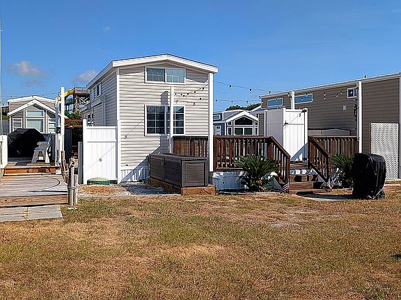 This fully furnished 2018 Stone Harbor park model with double loft is located on the west side of the Boardwalk RV Park, a private, gated oceanfront community in Emerald Isle, NC. Just steps to the private beach entrance accessible only to residents of the Boardwalk RV Park. Located just a few blocks away from the Emerald Isle bridge, this prime location allows you to avoid busy island traffic but is still conveniently located within a mile of restaurants, shops, a movie theatre, putt putt golf, walking/biking trail and giant water slide attraction for the kids. This unit is perfect for year-round living or simply as your weekend beach retreat to get away from the world. A rarity in RV parks, this unit has an extended driveway that can fit two vehicles comfortably plus there is additional space to park a golf cart. Large grassy area behind the unit perfect for kids to play. Convenient hot/cold outdoor shower on the deck. There is a grill and two large rubbermaid storage units next to the deck; perfect for storing beach chairs and other gear. New deck lighting. Deck stained 9/25. AC unit serviced 2025. Walk inside this comfortable and stylish coastal beauty and you'll immediately notice the high vaulted ceiling in the living room, kitchen and dining area as well as the large windows that give this park model a spacious and airy feeling. This unit has a Comfort Aire ductless inverter AC/Heating system with wall units in the living room, bedroom and loft for maximum comfort. Low maintenance flooring throughout the lower level makes it easy to clean sandy floors. Large entertainment center in the living room with wall mounted TV. The lower cabinet is designed for storage or can be converted to accommodate a fireplace. Upgrades to the unit include: - Beadboard trim installed in living room and dining area - Tinted all windows to help control energy costs - Added sound bar and bass to entertainment system - Wrapped hot water heater with insulation The well designed, modern kitchen features white raised panel cabinets, Whirlpool appliances including refrigerator, gas stove and microwave. Double stainless sink with pull down faucet. Beautiful granite looking countertop with coordinating backsplash. L shaped breakfast bar with bar stools is a perfect spot to sit and have a snack or can be used as a food prep area. Gorgeous coastal hutch for extra storage with decorative mirror above. There is a large hall closet with electric/water hookups already installed. Nicely crafted white railings above the built in hutch in the dining area hint at the private loft areas upstairs. The master bedroom in the rear has a queen mattress with remote to adjust the height of the back or the feet, 2 night stands and wall cabinets separated by a wall mounted inverter AC/heat unit. Storage includes dual closets for hanging long or short items as well as built-in drawers. Additional storage space available under the bed. The bath has a shower with 2 benches and glass door, linen closet and cabinet above the commode. The lofts upstairs are separated by the stairway which affords more privacy to each side. One loft has a queen mattress and the second loft has two twins. Great for storage or extra sleeping space for guests. All interior and exterior furnishings in the pictures convey with the exception of the comforter/quilts/sheets on the beds. 2025 annual lot lease is $5400. Lot rent has been paid by the seller through 12/31/25 so you don’t pay any lot rent till 1/1/26. Lot lease includes Brightspeed internet, and use of onsite trash dumpsters and maintenance of the common areas and security gates. $5000 transfer fee payable to the park owner at closing. Per the Boardwalk RV Park Lease you are NOT allowed to rent out the unit. Animals are allowed. Max 2 dogs per unit. The park is open year round.