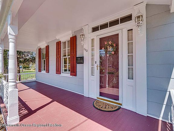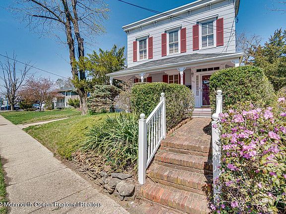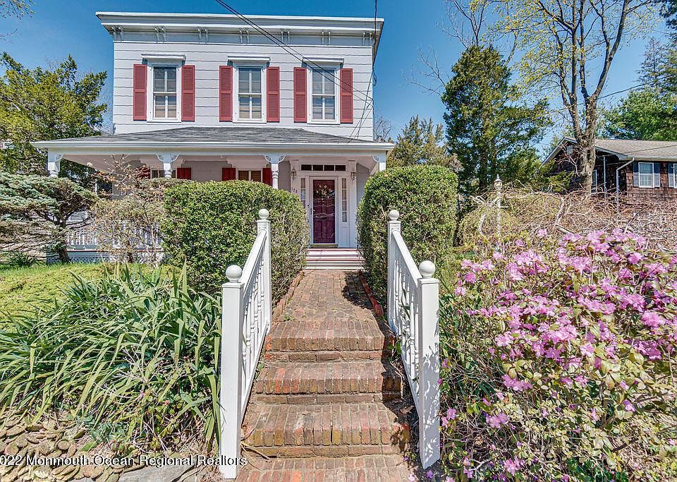 Well maintained Federal style colonial circa 1840 located at the heart of the NJ Shore. Elegant Victorian era house retains original historic features plus all modern amenities. Spacious entry hall, living room and dining room with 9 foot tall ceilings, newly updated kitchen with tile floor, solid cherry wood cabinets, granite counters, tile backsplash and stainless appliances plus laundry closet with new wood Shaker cabinets, washer & dryer and 1/2 bath with custom antique vanity sink and hardware. Large bedrooms with roomy closets plus computer room nursery or office, linen closet at top of wide landing and large tiled full bath brand new toilet, hardware, window and large closet. New paint, flooring and lighting throughout with original spindle wood wood banister, original fireplaces with custom tile, double Dutch farmhouse door with stained glass inserts, pane glass sash windows with aluminum storm windows and screens, covered front and rear porches with french doors overlooking large park like fenced back yard with tall shade trees plus 2 story carriage house barn with brick floor electric and water and roomy loft..use for storage or as garage or office. Long wide paved driveway offers plenty of parking. Steam radiators with newer oil boiler (2016) plus existing natural gas line from street to house which can be recommissioned for oil to gas conversion. Convenient to major transportation, shopping, restaurants, beaches, boardwalks and trails. Move in ready for new owner to enjoy.