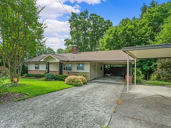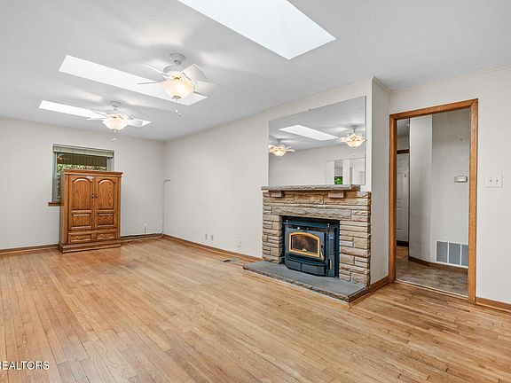 This charming WWII-era home showcases a blend of historical character with modern updates. Step inside to find classic original hardwood floors, adding warmth and character. The 2 bedrooms and 2 bathrooms provide comfortable living space for a variety of needs. The property has beautiful custom interior doors, and the exterior doors feature the distinctive Oak Ridge oak leaf and acorn cutout designs, a charming local detail. The living room has high ceilings with skylights for natural light and a buck stove for nippy mornings. The adjacent sunroom provides the perfect spot for an office and birdwatching and enjoying the peaceful surroundings of the greenbelt. Dedicated spaces downstairs for a den, craft room, and workshop provide opportunities for hobbies and projects. The layout allows for future expansion or conversion into additional living space. A level front yard, handsome stone walkways and landscaping add a touch of classic curb appeal to this basement rancher. Patios and deck offer convenient outdoor spaces for relaxation and enjoyment. Two carports offer covered parking and protection for vehicles. Low-maintenance Crab Orchard stone and vinyl siding, a new gas water heater, and one year old roof provide peace of mind regarding maintenance and efficiency. Refrigerator, microwave, freezer, washer, and dryer will convey. Schedule your appointment today!