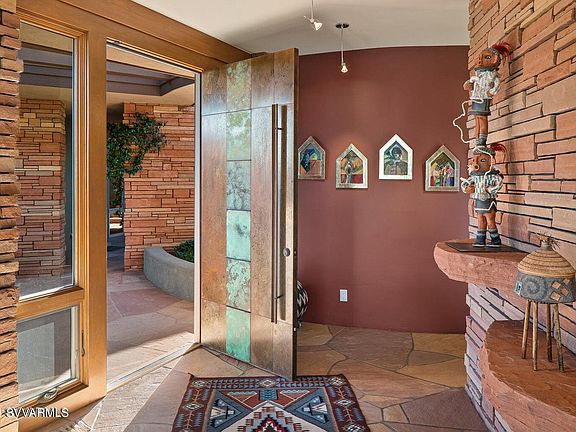 Securely located on the cal-du-sac of a high-end gated community this extremely private home is set high into the hillside, perfectly built to be part of the terrain and toward big northern and eastern views from Summit, Chimney Rock, Thunder Mountain and Lizard Head to Boynton Canyon and Bear Mountain. - The main house with living room open to dining and high-end kitchen - all three built around a large three-sided fireplace - features the master bedroom suite, a bonus room currently used as gym, and a powder room. The soothing sound of a water feature outside the master bedroom attracts a large variety of wildlife. Connected by a covered circular walk way, the casita offers two large guest bedrooms, a bath and a bonus room. One of the bedrooms and the bonus room are currently used as offices. -