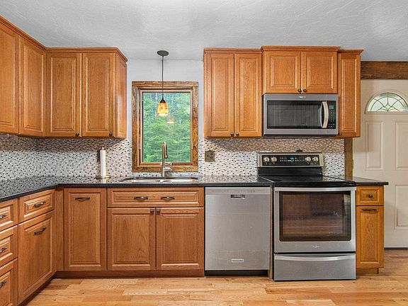 Country living, yet only minutes to Concord, & I-393. Well maintained tri-level home offers a flexible floorplan. The direct entry from the attached garage brings you into the family room with wood stove. Also on this level is an office, laundry room, bathroom, and built in storage. Walk up a few steps into the renovated kitchen, with custom white oak cabinets, granite countertops, pantry with pull outs, SS appliances, tiled backsplash, and HW floors. The living room also has HW floors, and honey locust wood accent wall. As you walk up the next few steps, there are two bedrooms, full bath with whirlpool tub, the master bedroom with walk in closet, and half bath. Metal roof is only 2 years old, windows in kitchen & living room are Marvin wood windows. Built in wall AC units throughout the house. The house is also wired for a stand alone generator with separate circuit box. Outside there is a HUGE (53' x 29')pole barn big enough to house massive construction machines, or horses if you prefer. Open, flat land is perfect for a paddock or two. Approx. 1.5 cords of wood will convey with the property. Lastly, a carport on the open land, could be utilized for covered storage, or redesign for a run-in shed.
