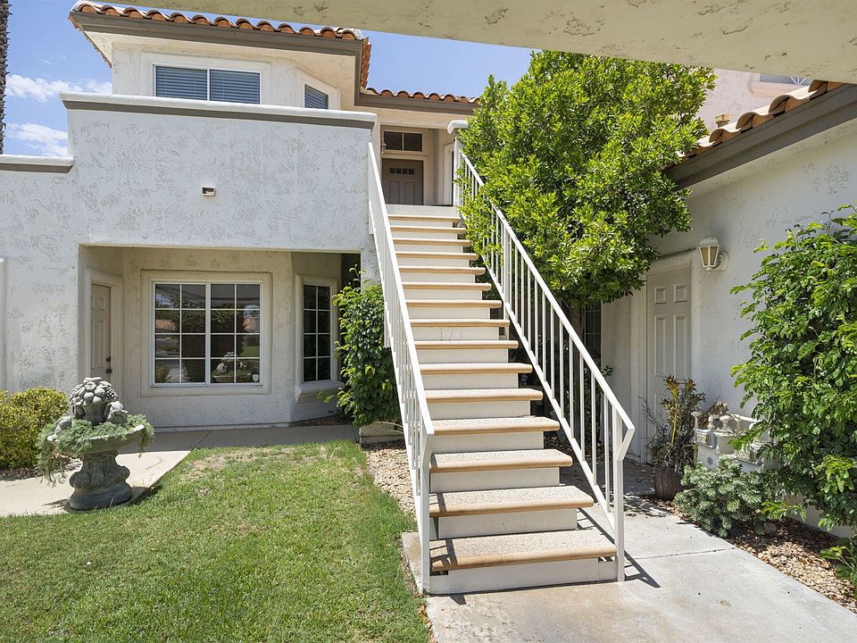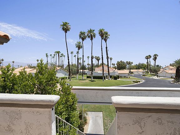 Views don't get better than this! From your patio enjoy panoramic views of fairways, lakes and southern Santa Rosa Mountains, as well as beautiful sunsets over the San Jacinto Mountains. Mountain Views from both of your private balconies, one in front and one in back. This updated upper level 3 bedroom, 2 1/2 bath popular floor plan features a living room with fireplace and formal dining area. The spacious kitchen is well appointed with stainless steel appliances, wine cooler, granite countertops with deluxe upgraded cabinets and a dinette area. There are tile floors in the kitchen and bathrooms as well as high quality carpet in the bedrooms and wood plank flooring through the entry and hallways. The large master bedroom with gorgeous westerly views has a walk in closet and spacious bathroom with dual granite vanities, separate garden bath tub and walk in shower. The additional bedroom suite with walk in closet is great for family or guests. There is a third bedroom/den/office and a separate laundry room with additional storage space. 2 car detached garage. This desirable community is located in the heart of Palm Desert. Included in your HOA dues is membership to a state of the art Health & Fitness Center, Tennis, Pickleball, as well as various social groups. 32 pools and spas, 24 hr guard gated, patrol security, landscaping, ground maintenance and building exteriors plus cable and internet.Close to great shopping, fine dining, casinos and Palm Springs Int'l Airport.