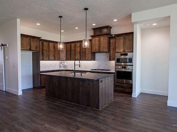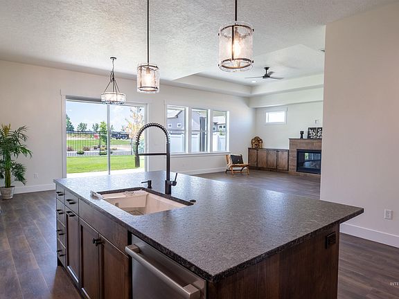 Another stunning home crafted by Rugged Terrain Homes. GreatRm design w/amazing open kitchen, large honed granite island/breakfast bar w/deep sink, surrounded by tons of cabinetry/storage, walk-in pantry & Bosch appliances. Living Rm crowned w/coffered ceilings, has great light throughout, cozy tiled fireplace, easy access to office/den w/barn doors & closet. Primary boasts beautiful walk-in shower, soaker tub, dual vanities w/large quartz countertops & tiled backsplash. Secondary bedrooms w/ceiling fans. Notice the extras, tile feature wall in bathroom, mud bench, folding station in laundry, window seats, upgraded lighting pkg & attention to detail at every corner. 41ft deep finished RV garage complete w/Hot/Cold water spigot, 50 Amp plug+2nd rollup door for easy mower access (for nearly 1/4 acre) or hanging out in the awesome garage (imagine playing corn-hole INSIDE when weather is bad!) HOA includes pressurized irrigation. Backs to common ground, cornder lot-neighbors on one side only!