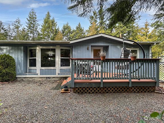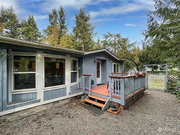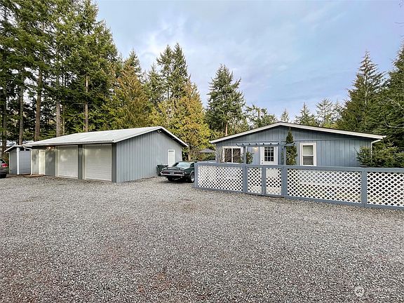 Lovely 1-level manufactured home on a peaceful 3/4 acre. Clean & well maintained interior: Dining off kitchen + breakfast bar, spacious utility room. Primary suite showcases double sinks & marble counter tops, soak tub & separate shower, & walk in closet. Features large 2 car, 860+ SF detached garage! Yard is perfect for hosting. Gravel parking, mature & low maintenance landscaping, gazebo, 2 wood decks, raised garden beds, & 2 garden sheds. Enjoy seclusion and a community beach while still being a short drive from city center of Sunny Sequim!