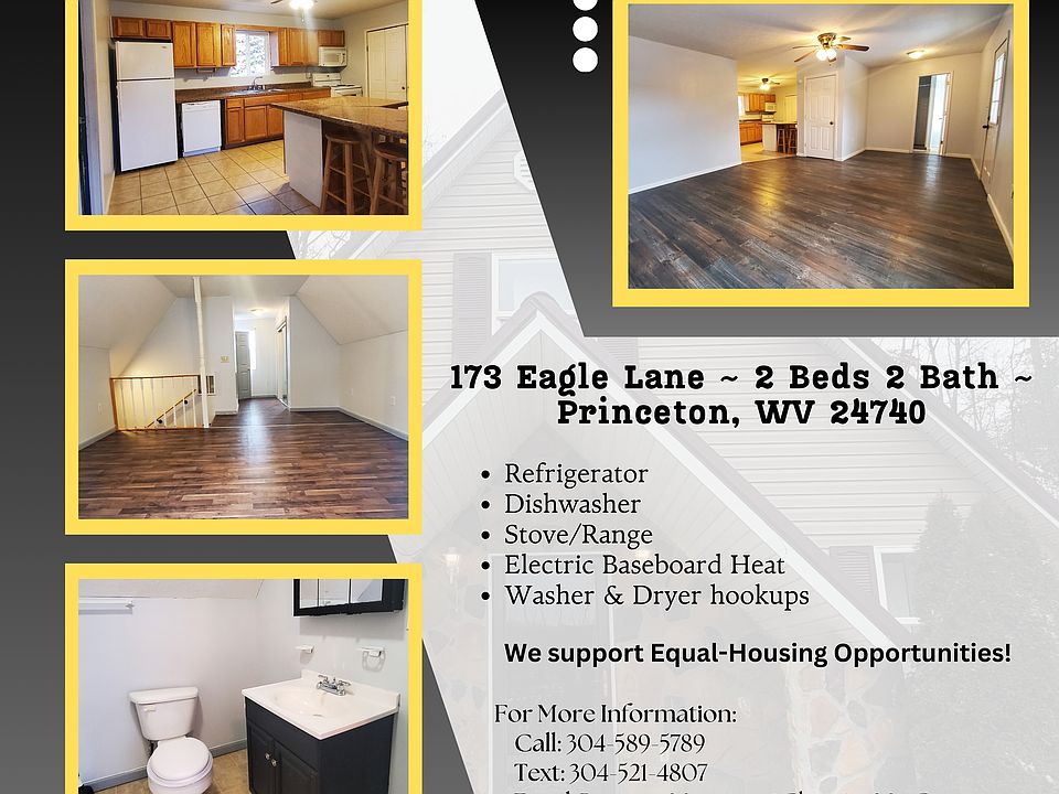 173 Eagle Lane ~ 2 Beds 2 Bath ~ Princeton, WV 24740 LEASE OPTION (Path to Home Ownership): Initial payment: $5,000 with no payments due until the 1st of the following month! Monthly payment: $850/month. No utilities included. or RENTAL: Security Deposit: $850. Can be made in payments if needed. Monthly payment: $850/month. No utilities included. Sorry, this home is not HUD approved. This two-bedroom two bath A frame home sits on private land and features a private driveway, fresh paint, new flooring, closets with built in shelves, new fixtures, two full bathrooms, spacious eat in kitchen with dishwasher, washer & dyer hookups conveniently located off of the kitchen on the main floor, lots of counter space with built in island and is furnished with stove & fridge. Property includes 1 acre. Electric baseboard heat. Located on Eagle Lane off of Kirby Addition Road behind Pine Tree Estates. Christian Management Corporation Office Hours: Mon-Fri 9:00AM-5:00PM & 10:00AM-2:00PM the 1st Saturday of every month You can view THIS property 7 days a week! Most pets welcome with a $300.00 pet fee per pet and signed pet agreement. Maximum 2 pets. No aggressive breeds due to insurance restrictions. Clean, safe, quiet, crime & drug-free are our priorities for our residents! We support Equal-Housing Opportunities! Good people with good, bad, low, or no credit but stable employment or Social Security are welcome. -MUST pass background check -NO evictions in the last 7 years -NO sex offenders Is this property not what you are looking for? View our other available #homes, #mobilehomes, #apartments, and more on our Facebook or our website!