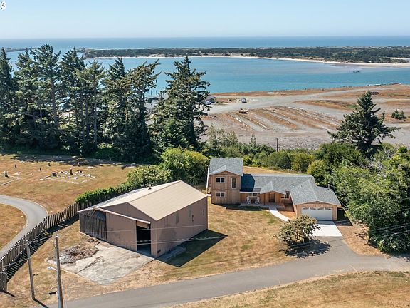 Rare coastal beauty offering an abundance of views; Ocean view, Coquille River View and Sandy Beach Views from most every room in the house! Did we mention the views? Thoughtful layout with open kitchen to living room and dining area and additional 1/2 bath off kitchen. Wide hallway has built-in cabinetry leading to 4 BD & 1 full BA downstairs. Upstairs offers primary bedroom suite that includes a sitting area, en suite BA and wind protected deck access to enjoy the views! New windows throughout. This home sits on .82 acres in city limits complete with a huge shop for storage or projects! RV & boat parking space. Approximately 1/2 mile to shopping center or the marina and Old Town area with boutique shops & restaurants then another mile to South Jetty beach access. Welcome home!