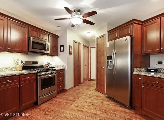 Updated, Spacious 3 bedroom, very private w/ remodeled kitchen, newer SS appliances, newer granite, hardwood floors, dual fireplace, large rooms, private patio overlooking green & mature trees. Newer furnace & A/C. Separate shower, lots of windows, volume ceilings, tons of closets, classic stairway with attractive open entrance way. This is a great home before you really downsize. It is spacious, with a large basement and enough rooms to fit all the furniture and have a place to go. A Private street with little traffic. Walk to stores & restaurants. This home is in a great area that is quiet and popular (easy to get to) Lemont offers great transportation including access to I355, I55, Archer & route 83, a classic downtown that is easy to walk around especially from this location, with new restaurants and lots of shops, most important great schools.